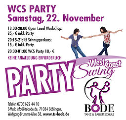 Bis 01:00 Uhr tanzen wir zu den besten West-Coast-Swing-Beats – ganz entspannt, ganz viel Spaß!
